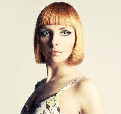 A very straight, mod fringe suits an oval face. It rounds the face, and draws attention away from the chin.